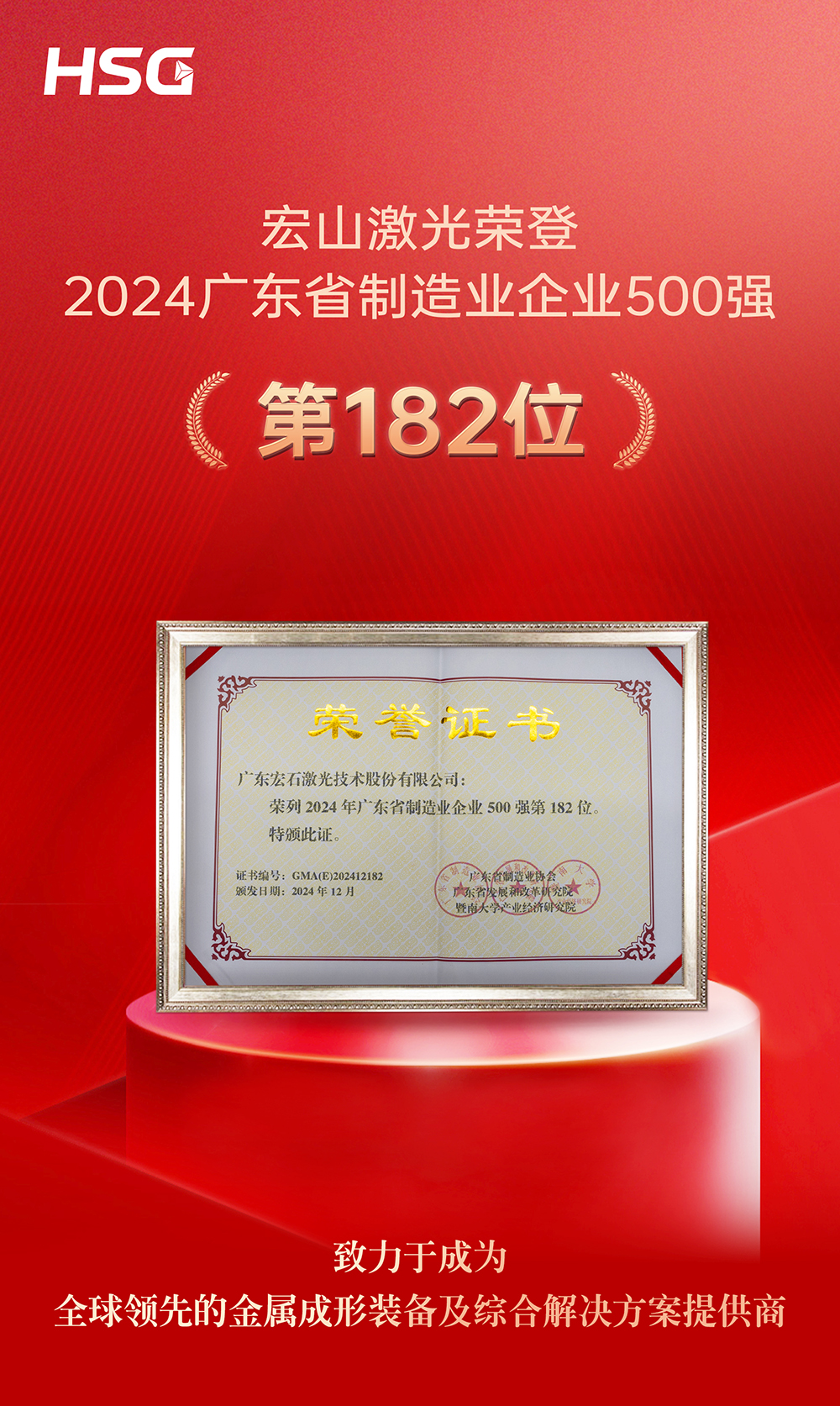近日,由廣東省制造業(yè)協(xié)會、暨南大學(xué)產(chǎn)業(yè)經(jīng)濟研究院、廣東省發(fā)展和改革研究院聯(lián)合發(fā)布的《2024年廣東制造業(yè)500強企業(yè)研究報告》正式揭曉榜單。作為全球激光切割技術(shù)領(lǐng)域的卓越創(chuàng)新者之一,宏山激光憑借在智能激光制造領(lǐng)域的出色表現(xiàn)與穩(wěn)健發(fā)展,成功位列第182位。這一殊榮不僅體現(xiàn)了行業(yè)對宏山激光的高度認可,也彰顯了廣東制造業(yè)在高質(zhì)量發(fā)展道路上的強大潛力。